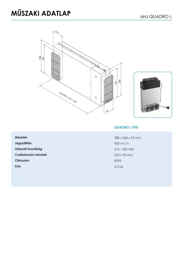 Az AIRA QUADRO L plazma szűrő alkalmas minden pultba építhető páraelszívóhoz, legyen az akár főzőlappal kombinált is. A QUADRO plazma szűrő kifejezetten ezekhez az elszívókhoz lett kifejlesztve. A legmagasabb teljesítményt nyújta minimális helyigény mellett. A QUADRO L plazma szűrőt az alsó szekrényben lehet elhelyezni. Amint bekapcsolja az elszívót, a beépített elektronikus érzékelő automatikusan bekapcsolja a plazma szűrőt (1 m/sec sebességgel) és azonnal megkezdi a levegő szűrését. Amint kikapcsolja az elszívót, a plazma szűrő is lekapcsol. (0,5W fogyasztás készenléti üzemmódban).