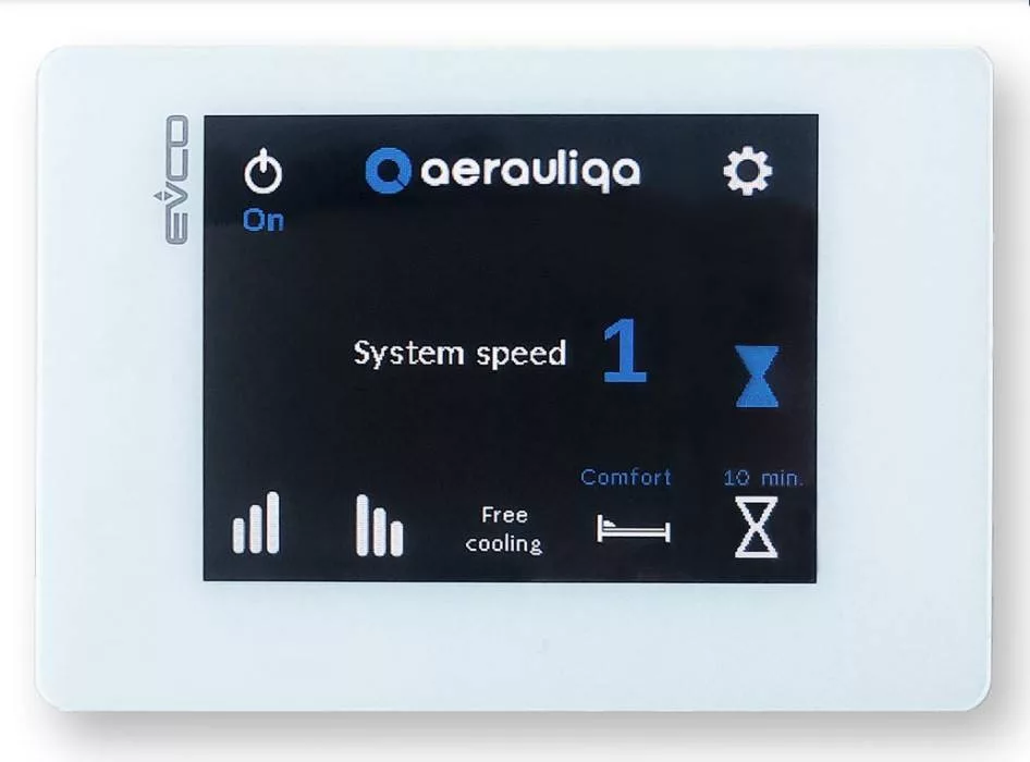 3,5” színes, grafikus kijelzős, multifunkcionális érintőkijelzős közonti szabályzó egység Aerauliqa Quantum ORION típusú egyhelyiséges hővisszanyerős szellőztető készülékekhez.