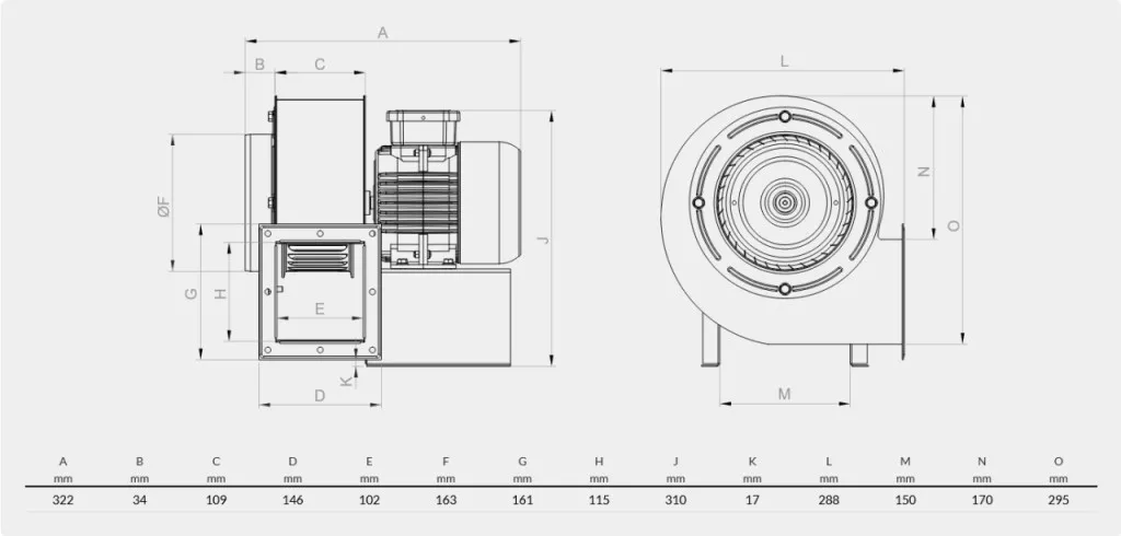 A ventilátor lapátok aerodinamikailag továbbfejlesztett kialakítással rendelkeznek a hatékonyság növelése, az áramlási veszteségek minimalizálása érdekében. Egyoldalt szívó radiális kialakítású ventilátor, előre hajló lapátozással.
