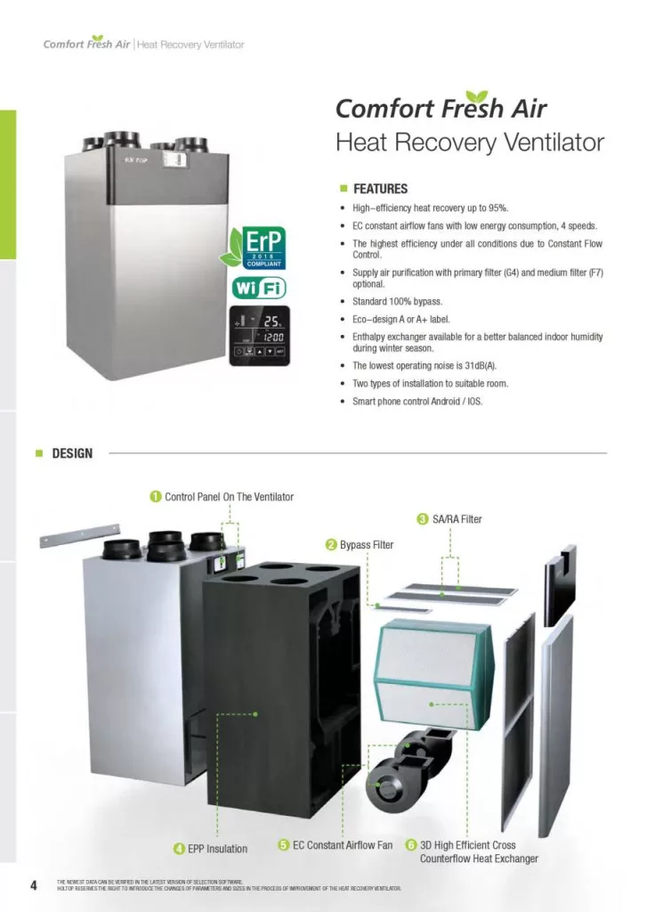 Az EC motorok állandó légáramlást biztosítanak, négy sebességfokozattal, miközben alacsony energiafelhasználással és mindössze 31–35 dB(A) zajszinttel működnek. A rendszer A vagy A+ energiahatékonysági osztályú, és akár -25 °C külső hőmérsékletig is biztosítja a stabil légcserét. A 100%-os automatikus bypass funkció a nyári hónapokban hűvösebb kültéri levegő esetén természetes szellőzést tesz lehetővé.
