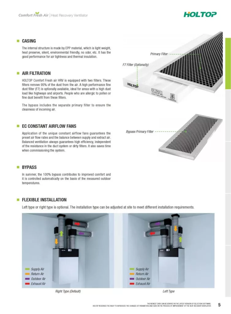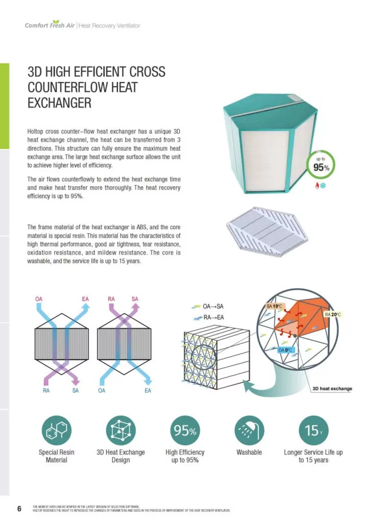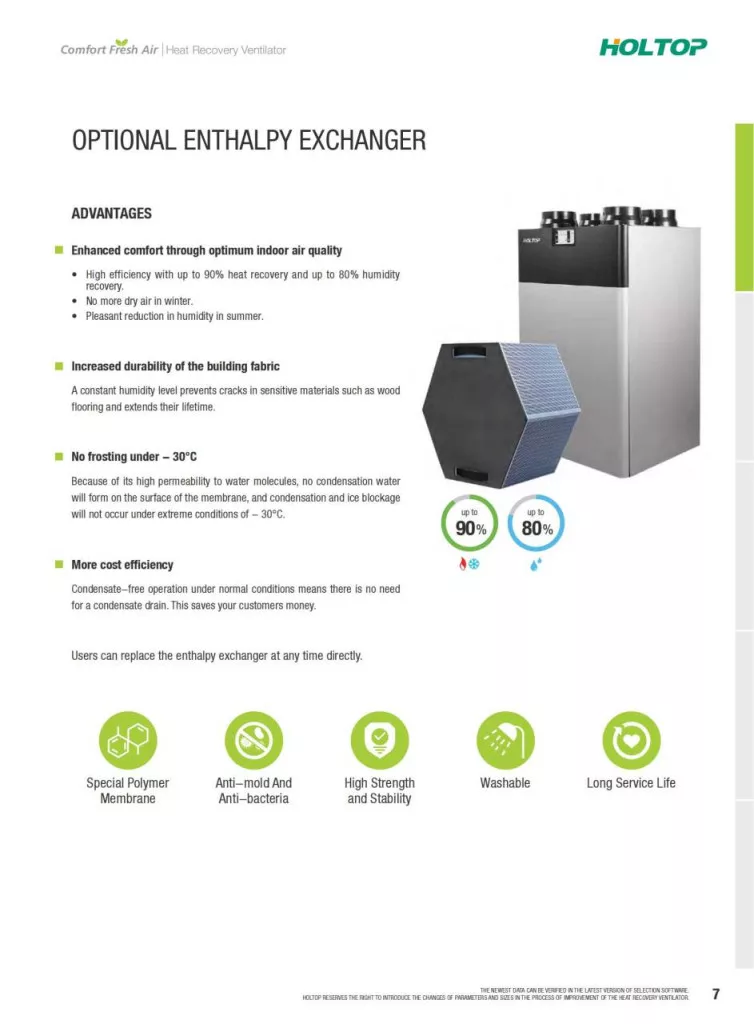 A HOLTOP egyedi, 3D kereszt-ellenáramú hőcserélője speciális, gyantával erősített ABS szerkezetből készült, amely rendkívül légzáró, penészálló és akár 15 éves élettartamot biztosít. A nagy hőátadó felület maximális hatékonyságot eredményez, míg az ENTALPIA hőcserélős változatok akár 80%-os páravisszanyerésre is képes. Ez a megoldás különösen hasznos télen a túlzott levegőszárazság elkerülésére, illetve nyáron a felesleges páratartalom csökkentésére.
