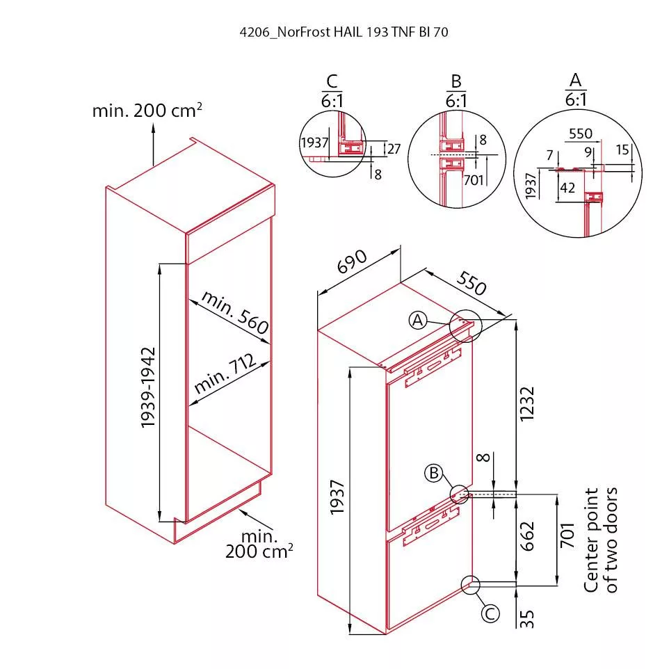 NODOR - Beépíthető hűtőszekrény kombinált NorFrost HAIL-193 TNF BI 70 + Ajándék Hűtőtáska